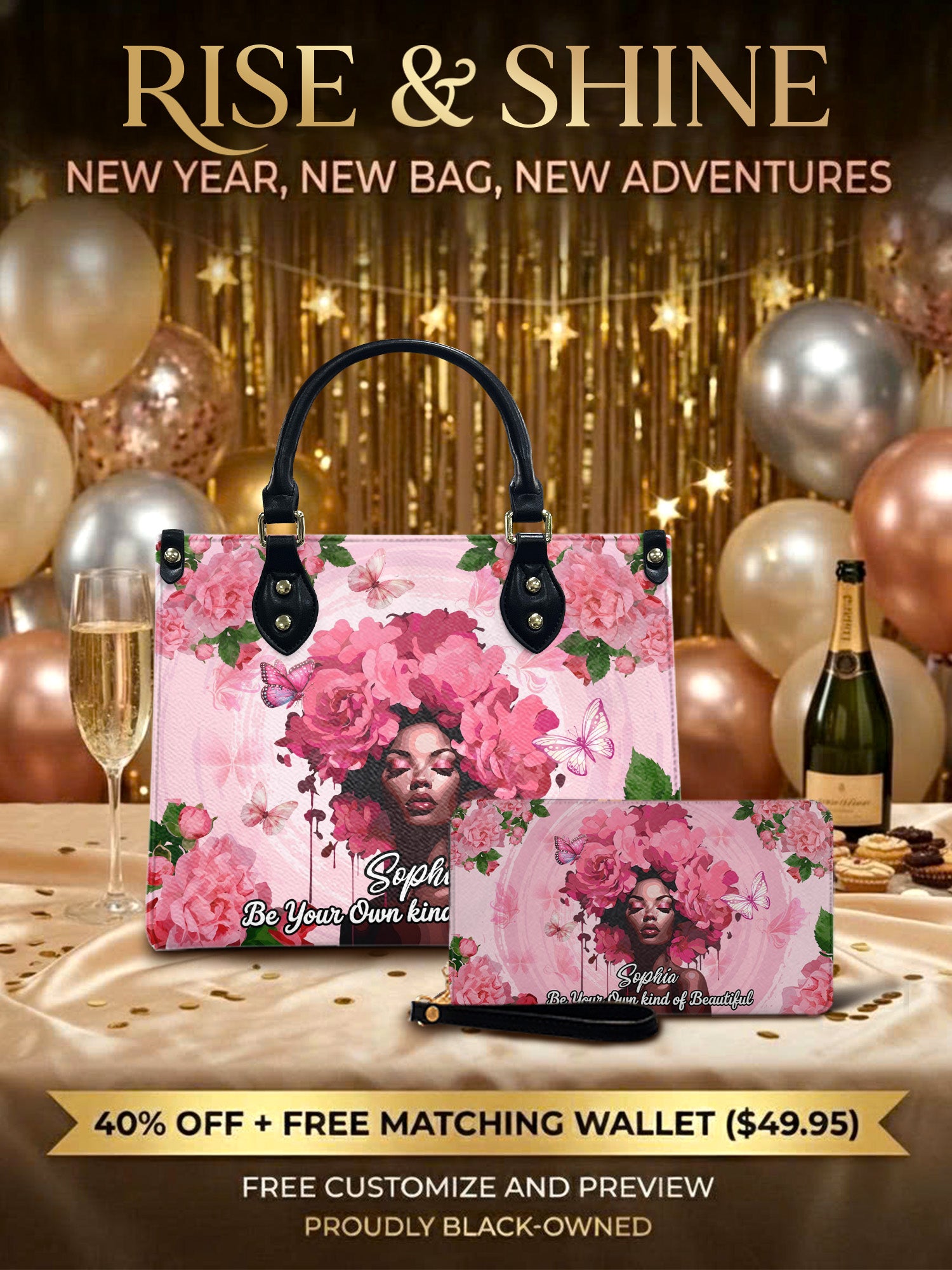 Unleash your unique radiance with the Blossom Muse handbag, a celebration of individual beauty. Adorned with blooming roses and butterflies, this bag carries the elegant reminder: "Be Your Own Kind of Beautiful." It's a daily affirmation for Black women to embrace their authentic selves, to bloom where they are planted, and to always shine in their own magnificent way.
