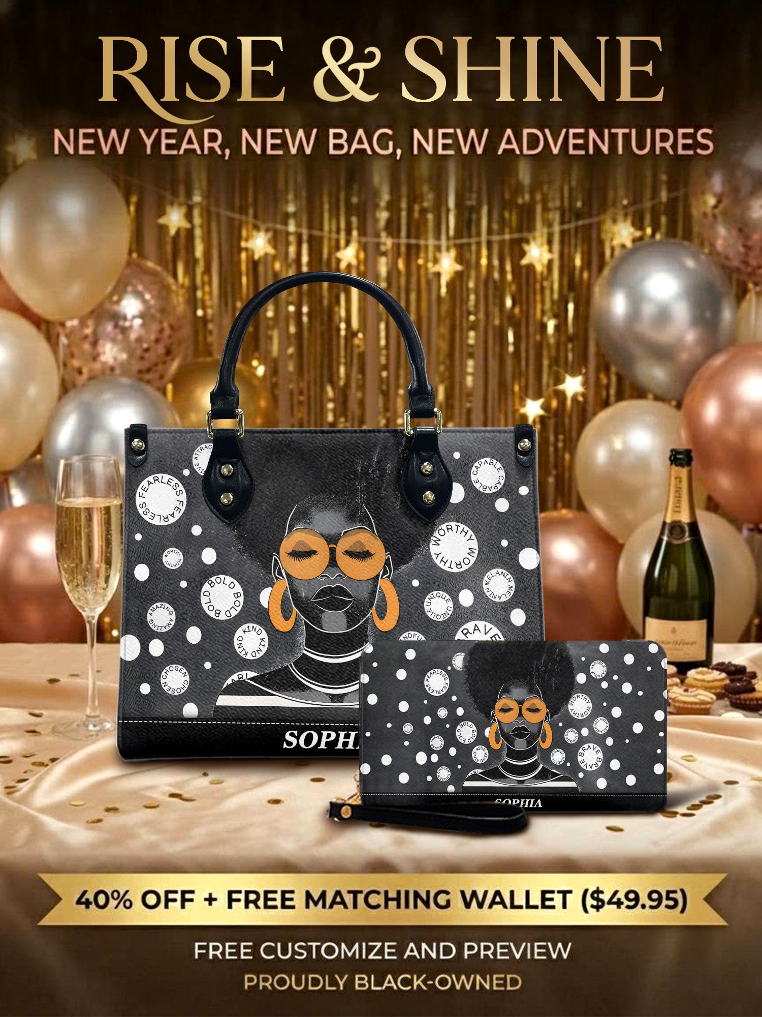 Carry confidence with the Circle of Strength handbag, a stylish and powerful tribute to Black women. The bold portrait is surrounded by "circles of strength" that are filled with affirmations like "FEARLESS," "BOLD," and "WORTHY." This bag is a chic reminder that you are surrounded by your own power and a testament to the fact that your worth is endless.