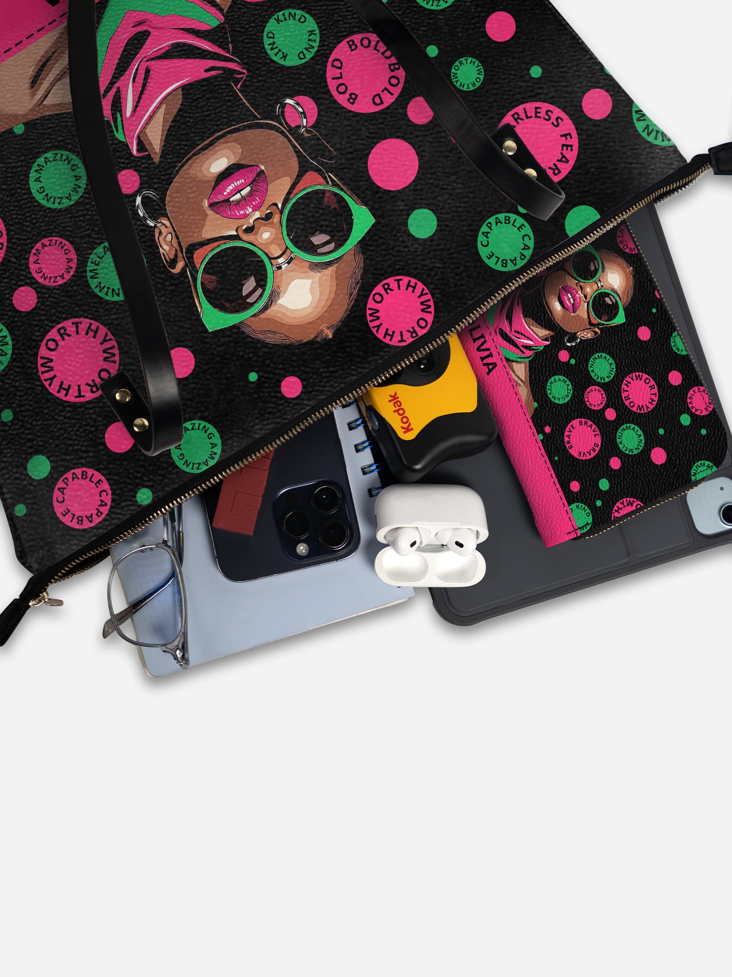Melaniva “Fearless Beauty Rising” Leather Totebag — a bold tribute to confidence, courage, and radiant self-expression.