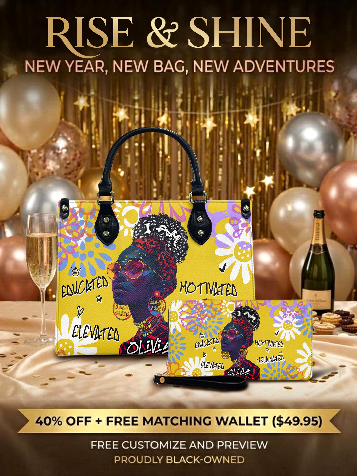 Elevate your style and spirit with the "Melaniva I Am Elevated" Handbag. Its sun-kissed yellow canvas bursts with the radiant energy and vibrant personality of the Black woman who knows her worth. Adorned with powerful affirmations and a proud portrait, this bag is a daily declaration: "I Am Educated, Motivated, Elevated, and Melanated."