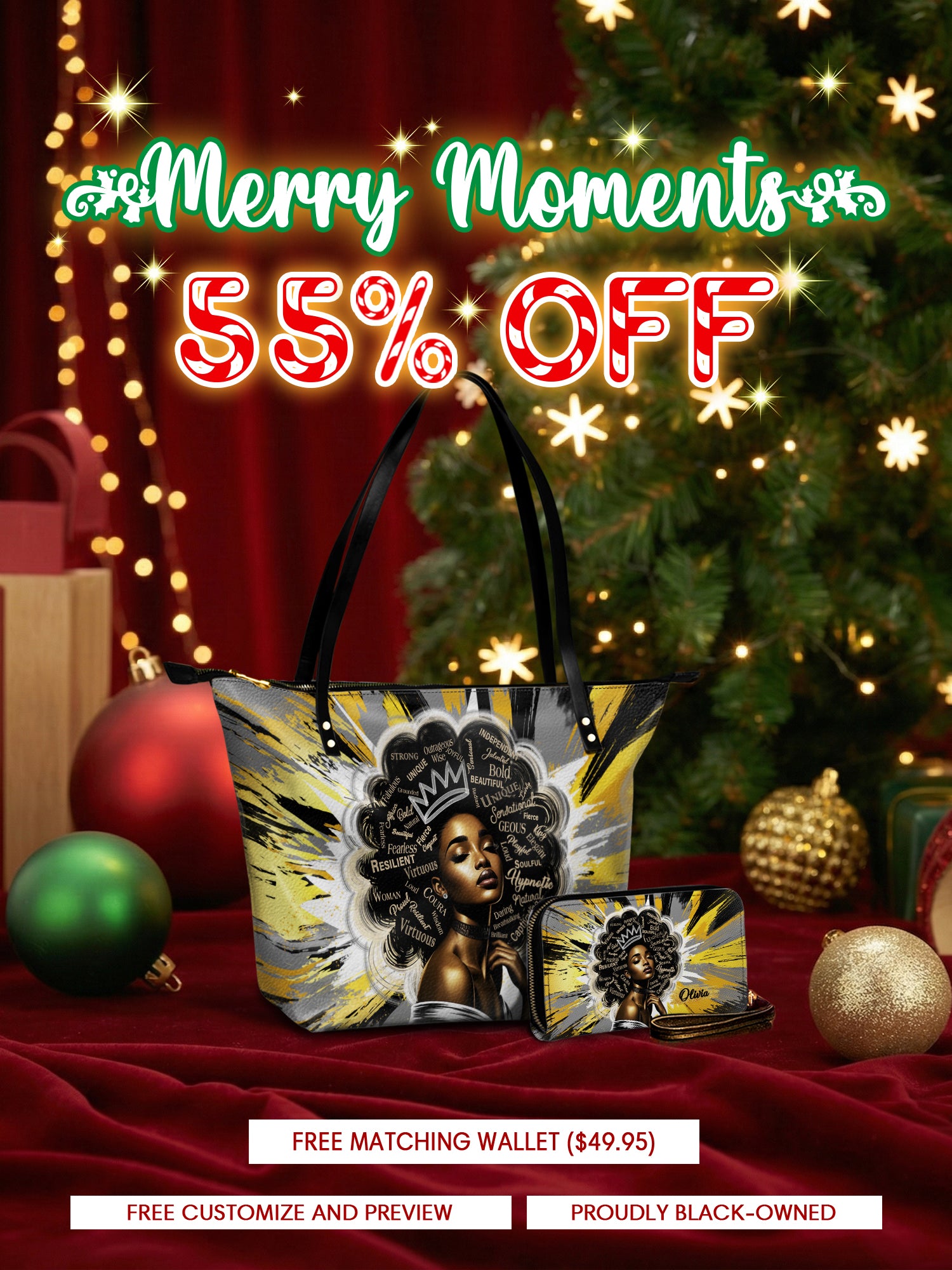 Behold the Melaniva Solar Halo Leather Tote Bag, a dramatic burst of gold and light that affirms your royalty. Crowned with powerful words like "Resilient" and "Worthy" hidden in her afro, this essential tote is a gorgeous reminder that your radiance is limitless and your power is absolute.