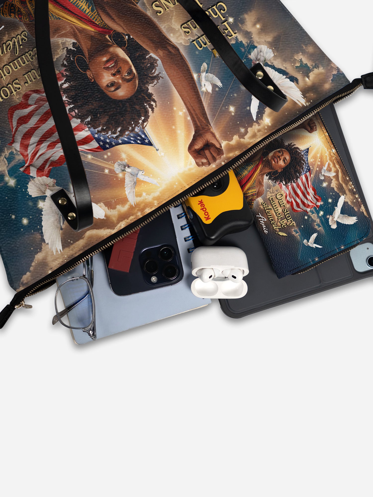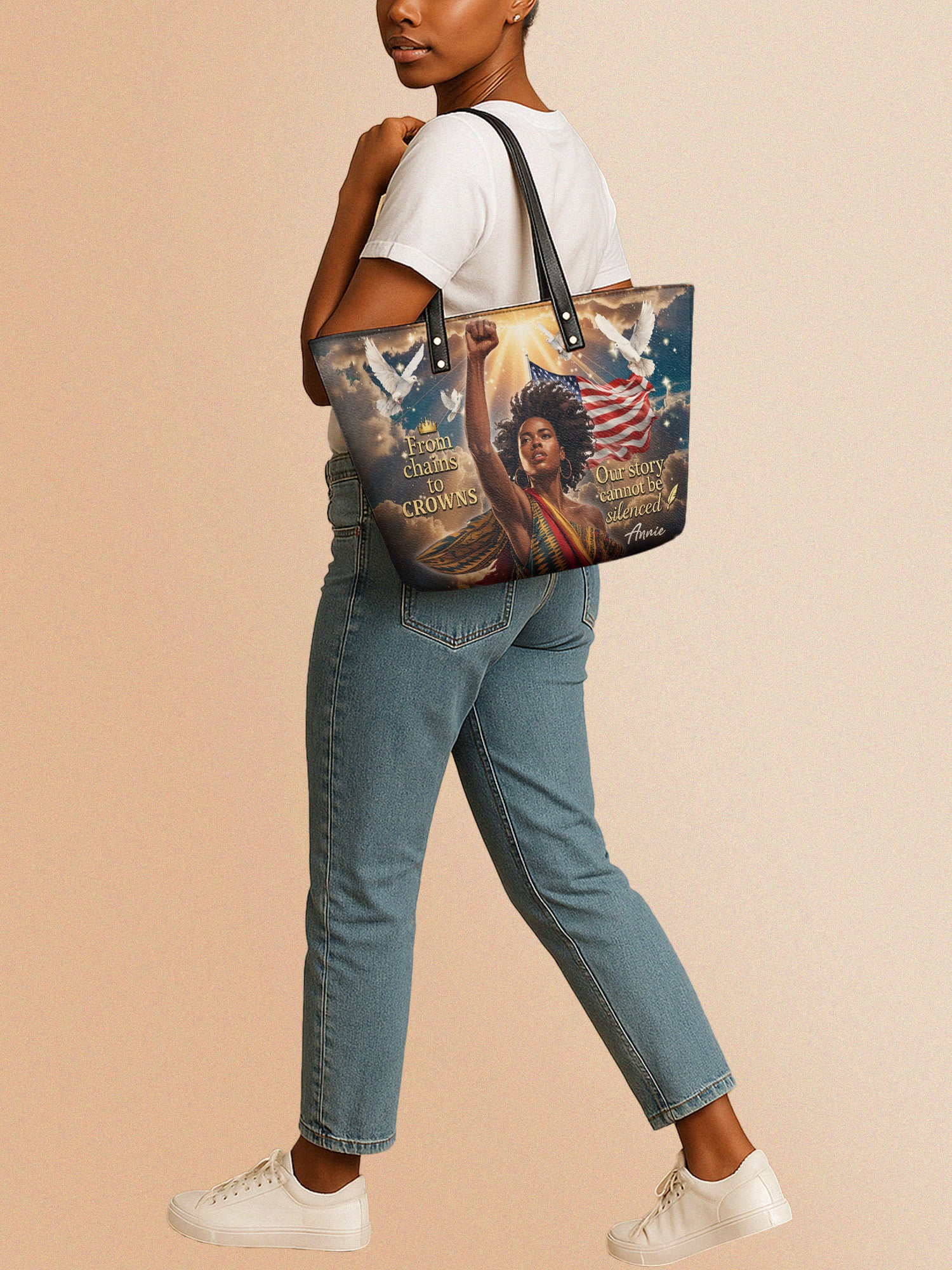 She carries more than her daily essentials—she carries a story of strength. The Melaniva Story of Strength Leather Totebag honors the journey from chains to crowns, a powerful reminder that resilience and pride cannot be silenced. With soaring doves and bold artistry, it’s more than just a spacious leather tote—it’s a canvas of history, courage, and beauty. Every time she steps out, she doesn’t just wear fashion; she wears her legacy.